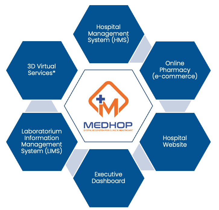 MEDHOP Software memiliki 6 solusi terintegrasi yaitu Sistem Informasi Manajemen Klinik, Sistem Manajemen Apotek, Sistem Informasi Manajemen Laboratorium (LIMS), CMS & Website Klinik, Apotek Online (E-Commerce) dan Virtual Room dengan immersive platform dan video conference untuk layanan online klinik.